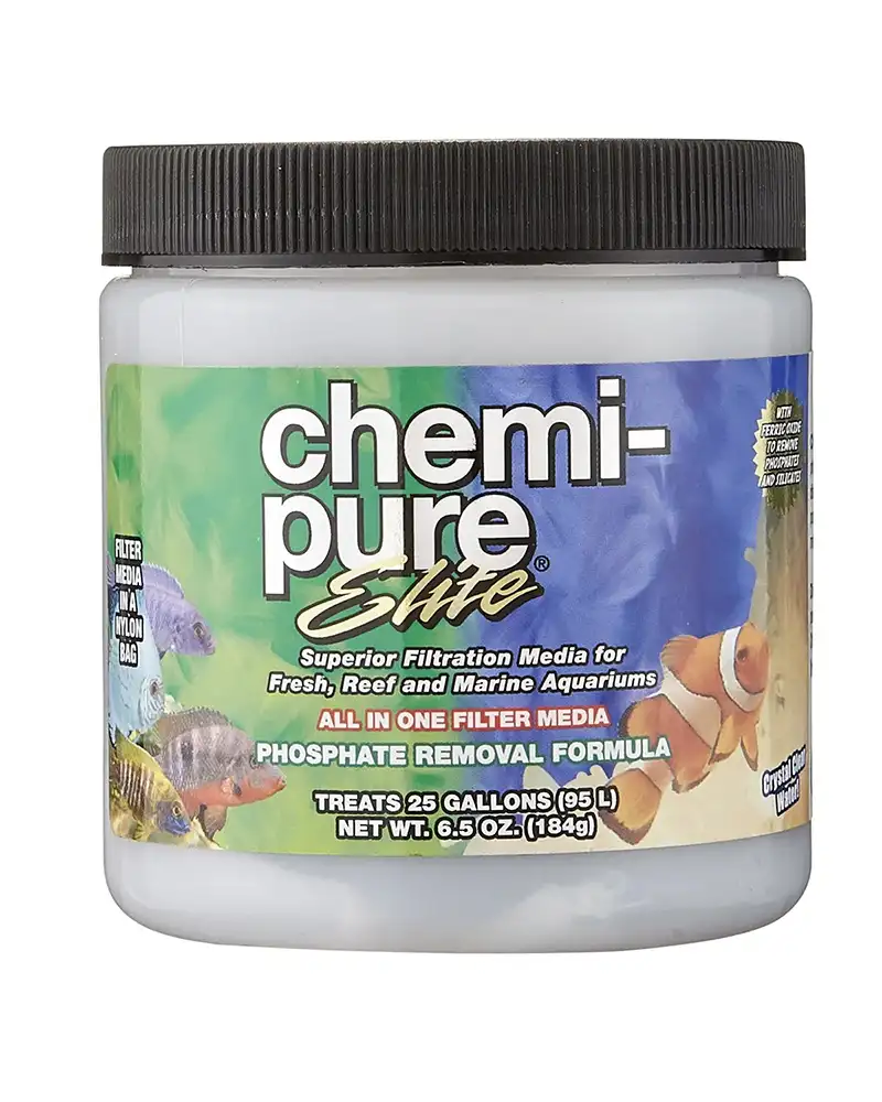 Al combinar GFO (óxido férrico granular) con carbón peletizado premium de Boyd y colocarlos dentro de una bolsa de nailon de malla fina, Chemi-Pure Elite ofrece una forma práctica y eficaz de purificar el agua de olores y toxinas, a la vez que elimina rápidamente los fosfatos y silicatos que pueden provocar el crecimiento excesivo de algas. Junto con una alimentación adecuada y un programa regular de cambios de agua, Chemi-Pure Elite puede simplificar enormemente el mantenimiento, contribuir a la estabilidad del sistema y mejorar la apariencia general de su acuario.