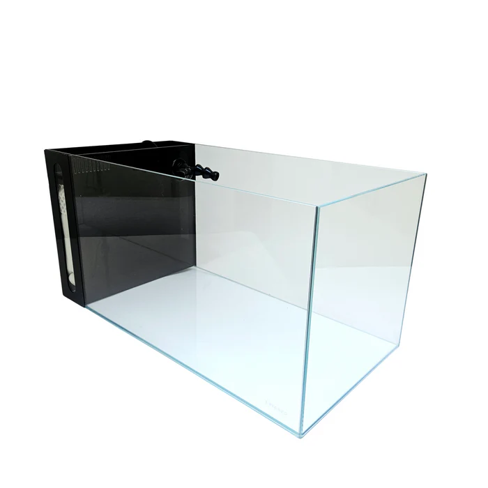 Crystal™ serie península de 14,26 galones: vidrio con borde biselado ultra transparente y bajo en hierro. Incluye un filtro trasero incorporado con bomba Quiet One, funda de filtro mecánico de alto pulido, chorro direccional, una almohadilla de aislamiento/nivelación y opción para actualizar la bomba con la bomba  DC de 185 GPH con controlador.