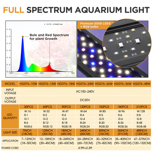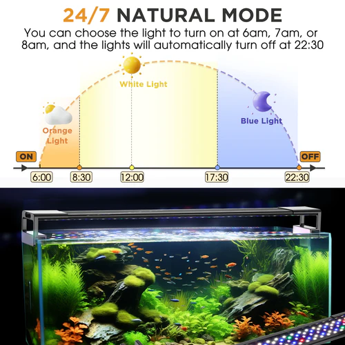 Esta luz mejorada de espectro completo para acuarios es ideal para acuarios de agua dulce y plantas. Cuenta con un modo natural 24/7 que imita la luz del amanecer, la luz del día y la luz de la luna, creando un ciclo uniforme de día a noche para tu acuario.