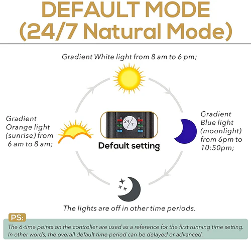 La luz LED para acuario Hygger 978 de espectro avanzado combina LED blancos brillantes de 6500 K con LED RGB para realzar los colores de peces y plantas. Cuenta con un modo 24/7 que imita los ciclos de luz natural, con tiempos de encendido y apagado ajustables.